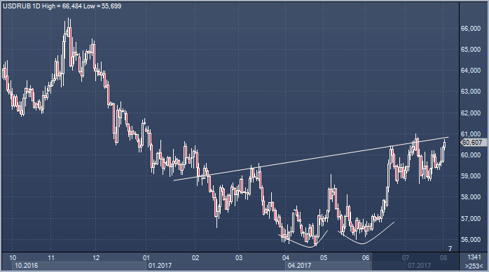 Раллировавшая несколько сессий нефть, наконец-то, решила скорректироваться, и это снова ударило по рублю, невзирая на то, что Рекс Тиллерсон рассказал, что у Трампа нет никакого желания подписывать закон о санкциях против России. Мы уже писали, что президент США сейчас находится в щекотливой ситуации: не подпиши он закон, подозрения в связях с Россией только усилятся. Как бы там ни было, конгресс наверняка преодолеет его вето. Итак, рубль падает сегодня вслед за ценами на нефть. Первые сделки по доллару США прошли на "Московской бирже" (MOEX: MOEX) в среду в диапазоне 60.4-60.53 рубля за доллар, а сейчас курс находится уже на уровне 60.69. Евро повысился до 71.74.