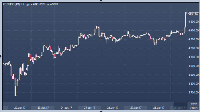 Последнюю пару недель биткоин консолидировался в довольно широком диапазоне, не в силах преодолеть его верхнюю границу около $4400-$4500, однако сегодня это произошло. Примечательно, что его взлет выше $4600 совпал с открытием торгов на американском фондовом рынке, хотя сегодня из-за очередного запуска баллистической ракеты КНДР гораздо большим спросом пользуются защитные активы, вроде золота и облигаций.