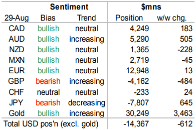 Как следует из последних данных CFTC, за неделю до 29 августа позиционирование крупных валютных спекулянтов претерпело минимальные изменения. Объем чистой короткой позиции по доллару вырос на $0.6 млрд до $14.4 млрд (в начале августа он достиг локального пика в $15.6 млрд).