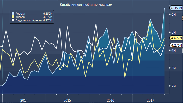 За 9 месяцев 2017 года Россия поставила в Китай 45 млн. тонн, Ангола — 39.9 млн. тонн, Саудовская Аравия — 38.5 млн. тонн.