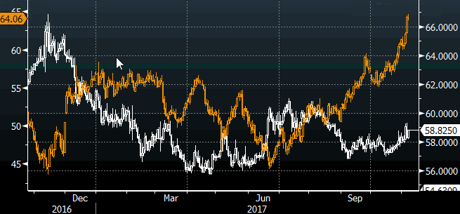 В аналитической среде активно обсуждается тема снижения корреляции «нефтяных» валют (валют стран-экспортеров нефти) с ценами на нефть. Такие валюты, как луни и норвежская крона, догоняют рост цен на нефть. Но значительная часть их возможностей и дальше отслеживать нефтяное ралли, закрывая образовавшийся гэп в корреляции, будет зависеть от собственной динамики доллара, и может потребоваться усиление «голубиной» риторики ФРС и пробуксовка налоговой реформы, чтобы корзина нефтяных валют смога указанный пробел закрыть.