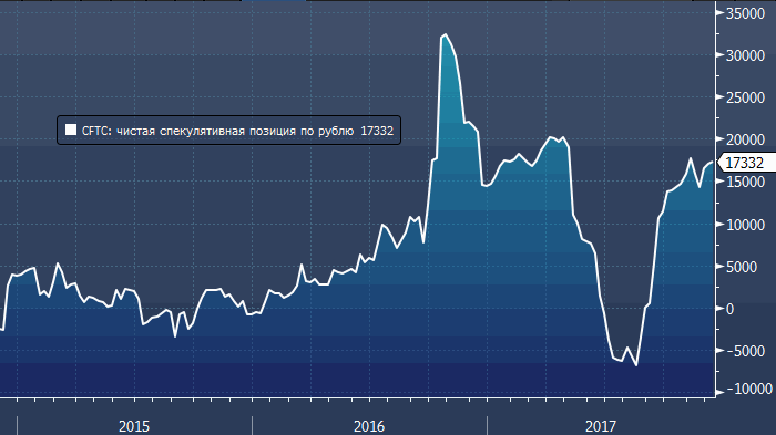 Как следует из последних данных американской Комиссии по торговле товарными фьючерсами (CFTC), за неделю до 12 декабря объем чистой длинной спекулятивной позиции во фьючерсах на рубль вырос на 350 контрактов (примерно 2%) до 17 332 контрактов. Таким образом, спекулянты находятся в чистом лонге по российской валюте уже 15 недель подряд, а до этого занимали чистую короткую позицию 10 недель подряд. С начала года курс доллара к рублю снизился примерно на 4%.