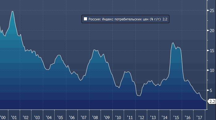 «Замедление годовой инфляции в январе до рекордных 2,2% в первую очередь связано с низкими темпами роста цен на продовольственные товары, динамикой цен в регулируемом сегменте и достаточно стабильным курсом рубля. В то же время, как отмечается в очередном выпуске информационно-аналитического комментария Банка России «Динамика потребительских цен», закрепление инфляции на низком уровне приобретает устойчивость благодаря факторам постоянного действия. По прогнозу Банка России, годовая инфляция на конец 2018 года может оставаться несколько ниже 4%.