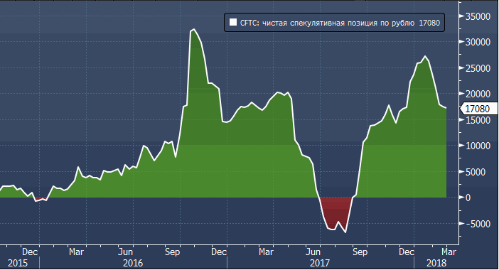 Ставки на рост рубля падают шестую неделю подряд. Чистая длинная позиция хедж-фондов по российской валюте за неделю по 27 февраля упала на 346 контрактов до 17 080, свидетельствуют данные Комиссии по торговле сырьевыми фьючерсами США. При этом короткие позиции выросли до 1511 фьючерсов, длинные - до 18591. Источник: ProFinance.Ru - Новости рынка Форекс