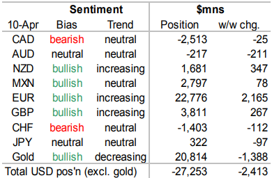 Как следует из последних данных CFTC, на неделе до 10 апреля объем чистой короткой позиции по доллару вырос на $2.4 млрд до $27.3 млрд (рекордное значение с 2011 года).