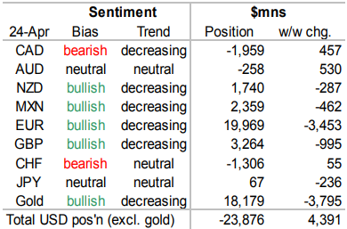 Как следует из последних данных CFTC, за неделю до 24 апреля объем чистой короткой позиции по доллару довольно резко сократился (-$4.4 млрд до $23.9 млрд, 6-недельный минимум) на фоне ликвидации лонгов в евро (-3.5 млрд до 20 млрд).