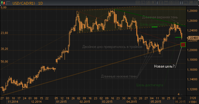 Наша очередная цель достигнута. В соответствии с техническими комментариями от 29 мая (на момент публикации USDCAD 1.2429), указанный целевой диапазон 1.2300/1.2260 был достигнут. Область сопротивления, представленная нижней границей диапазона, в котором цены пребывали в течение 1 квартала (пунктирная линия на графике ниже), а также линией тренда (зеленого цвета), которая отвечает за возобновление долгосрочной восходящей тенденции, смогла удержать натиск американского доллара и способствовала достижению канадской валютой вышеуказанной нами цели.