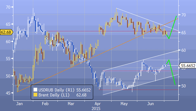 16:35 suny: Учитывая тот факт, что комфортная стоимость нефти для пополнения бюджета составляет 3450/3500 рубллей за баррель марки Brent, курс доллара к российскому рублю может подняться в область 57.00, затем сформировать двойную вершину и направиться обратно к 50 или даже 49 рублей за единицу американской валюты. Поддержку российской валюте может оказать устранение премии за риск с развивающихся рынков в случае стабилизации греческой ситуации, а также сокращение спекулятивных коротких позиций в российской валюте