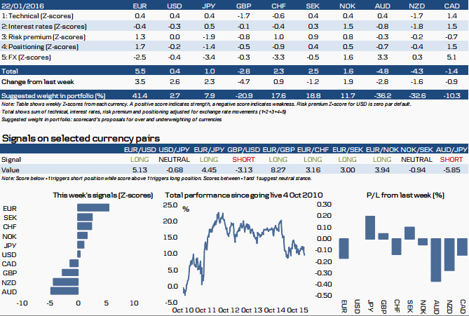На этой неделе наша торговая система G10 FX Financial Scorecard рекомендует к покупке: шведскую крону, евро и швейцарский франк, а к продаже: фунт стерлингов, австралийский и новозеландский доллар (вес в общем портфеле указан в таблице ниже). Рекомендации прошлой недели привели к убытку в размере 0.8%. Продажа австралийского, новозеландского и канадского доллара обошлась слишком дорого для портфеля, в то время как покупка еро и франка проявили себя хорошо. Следующие сигналы модели будут опубликованы 1 февраля.