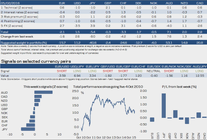 На этой неделе наша торговая система G10 FX Financial Scorecard рекомендует к покупке: австралийский, канадский и новозеландский доллар, а к продаже: иену, франк и евро (вес в общем портфеле указан в таблице ниже). Рекомендации прошлой недели привели к прибыли в размере 1.9%. Особенное результативной оказалась покупка японской валюты. Следующие сигналы модели будут опубликованы 15 февраля.