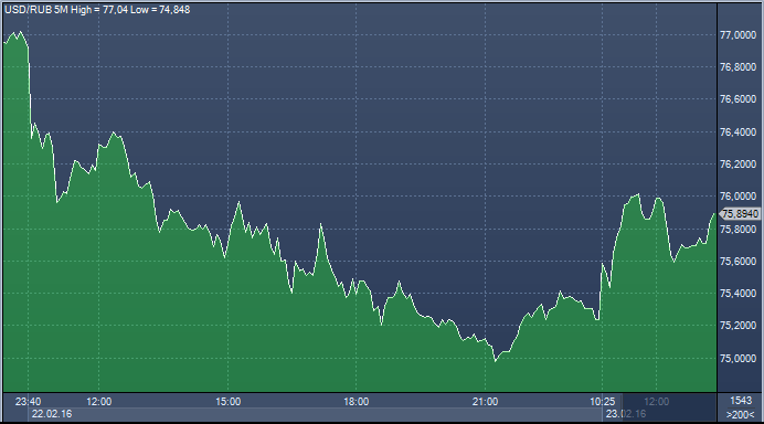 Российский рубль снижается против доллара во вторник на внешних рынках, так как цена на нефть снова падает. Курс рубля снижается на 0,9% в офшорной торговле до 75.8899/USD, отражая потери нефти. Последняя корректируется после того, как в понедельник сорт Brent подскочил на 5,1%. Рынки в России закрыты во вторник по случаю празднования Дня защитника отечества. Котировки Brent снижаются сегодня на 1,8% до $34.05/баррель, поскольку Международное энергетическое агентство (МЭА) прогнозирует перенасыщение мирового рынка сырьем в 2017 году. Российские правительственные облигации со сроком погашения в 2027 также падают, их доходность прибавляет 2 базисных пункта до 9,93%. Также МЭА сообщила, что прогнозирует сокращение производства российской нефти к 2021 году. Основным драйвером для ослабления цен на нефть сегодня выступают новости о прекращении огня в Сирии, начиная с 27 февраля. Об этом договорились президенты двух стран — России и США.