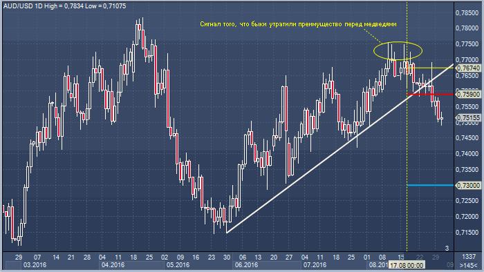 Аусси/доллар. 17 августа: продажа от 0.7674, цель 0.7300, новый стоп 0.7590 (пред. 0.7860). Текущий результат +161 пункт Источник: ProFinance.Ru - Новости рынка Forex