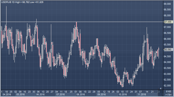 | 28.11.16 13:48 | Sberbank CIB ждет ослабления рубля выше 65.00 | 28.11.16 15:40 | Credit Agricole: в среду около 19:00 МСК ждите агрессивной продажи доллара |