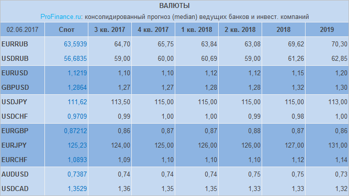 Представляем вашему вниманию ежемесячно составляемую таблицу консолидированных прогнозов (median), актуальных на текущую дату (позволяют оценить настроения рынка и обозначают «средний градус по больнице»). Расчет медианного значения включает лишь те прогнозы крупных банков и инвестиционных компаний, которые были опубликованы не позднее 3 месяцев от текущей даты. Однако по статистике превалирующее большинство респондентов не имеют прогноза старше 14 дней от текущей даты. Предыдущую публикацию прогнозов от 4 мая можно посмотреть тут.