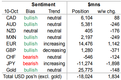 Как следует из последних данных CFTC, за неделю до 10 октября спекулянты несколько сократили объем чистой длинной позиции по доллару, однако он остается в области недавних максимумов, составляя $18 млрд. Почти вся активность в отчетном периоде оказалась ограниченной евро, который активно покупали, и иеной, которую также активно продавали. Единая валюта остается наиболее купленной, за ней следуют луни и аусси. Спекулятивное позиционирование в фунте, киви и франке носит нейтральный характер, а иена является единственной отчетливо проданной из основных.
