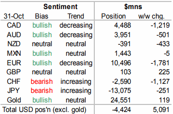 Как следует из последних данных CFTC, за неделю до 31 октября объем чистого шорта по доллару сократился более чем вдвое (на $5.1 млрд до $4.4 млрд), причем спекулянты покупали его против всех основных валют, за исключением фунта. Евро продолжает возглавлять список главных фаворитов, за ним следуют аусси и луни. Единственный отчетливый аутсайдер — иена, а позиционирование в мексиканском песо, фунте, киви и франке по историческим меркам близко к нейтральному.