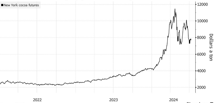 Фьючерсы на какао в Нью-Йорке достигли рекордного уровня, превысив $11 000 за тонну в апреле из-за плохого урожая в Западной Африке. Даже после коррекции они все еще более чем вдвое превышают уровень прошлого года в это же время.