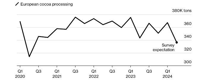 Согласно опросу шести аналитиков и трейдеров, проведенному Bloomberg, объемы переработки какао-бобов во втором квартале, вероятно, снизились по сравнению с аналогичным периодом прошлого года. По средним оценкам, в Европе, крупнейшем потребителе шоколада, показатель снизился на 2%. Все шесть экспертов ожидают более значительного глобального снижения во второй половине года.