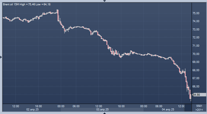 Эталонная нефть марки Brent потеряла 14% всего за два дня, упав ниже 65 долларов за баррель, в то время как фьючерсы на американскую нефть также достигли самого низкого уровня с 2021 года.