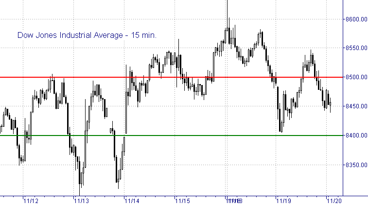 Индекс Dow продолжил снижаться при открытии торгов, однако затем в середине сессии мы увидели неплохое восходящее движение. Затем индекс снова упал перед закрытием, что открывает дорогу к новым низам на нижней границе консолидации фигуры вымпел, видимой на часовом графике. Чтобы подтвердить нисходящую тенденцию индексу нужно пробить вниз отметку 8,400 сегодня. Это окончательно сформирует фигуру вымпела и подтвердит прорыв вниз. С другой стороны, движение выше 8,550 может сломать нисходящий тренд и начать формировать тенденцию роста. Так что внимательно наблюдаем за возможным движением ниже 8,400 или выше 8,550. Как мы упомянули вчера, Dow продолжает формировать правое плечо в фигуре "голова-плечи", формирующейся на дневном графике. Прорыв отметки 8,300, вероятно, вызовет массовые продажи.