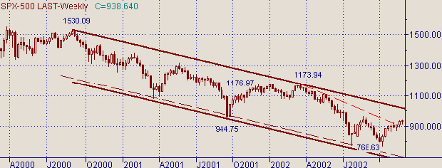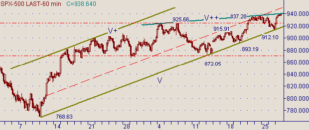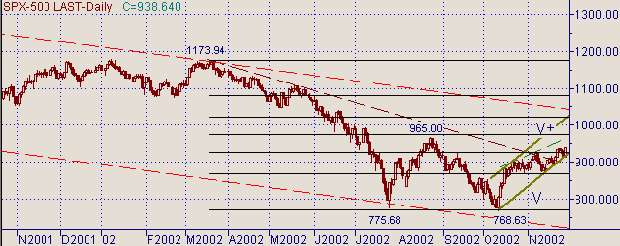 Параметры последнего торгового дня: Open=913.31, High=940.41, Low=913.31, Close= 938.64. На рис. 1, 2 и 3 приведены графики с периодами неделя, день, 60 мин. коррекции от нисходящего движения 1173.94-768.63 − см. на рис. 2), а так же протестировал линию V++, проведенную через два значения - 925.66 (максимум 6/11/02) и 937.28(максимум 22/11/02) − см. на рис. 3. Целью восходящего движения можем считать интервал 965.00-971.00. Значению 965.00 соответствует максимум 23/08/02, а значению 971.30 - 50% коррекции от 1173.94-768.63. Кроме того, на уровне 958.00 находится точка равенства восходящих веток: 775.68(25/07/02)-965.00(23/08/02) и ветки с началом от 768.63(11/10/02) −см. на рис. 2. V-V+ мы рассматриваем как составляющая часть коррекционного движения от снижения значения индекса 1173.94-768.63. Вторая ветка в канале V-V+ на рис. 3 формируется из следующих поддвижений: первая ветка 872.05-915.91 длиной 4386п.; вторая ветка 893.29-937.28 длиной 4409п.; третья ветка началась от 912.10 и примерная цель для неё находится на уровне 956.00. V заканчивает свою активную жизнь, а вместе с ней и канал V-V+. В этом случае ожидаем повторных попыток тестирования 870.00. Здесь возможно формирование локального дна и начало новой восходящей ветки в рамках коррекции от 1173.94-768.63. V отдаем предпочтение покупкам. В случае превышения уровня 940.00 и последующего тестирования этого уровня сверху открывать длинные позиции с целью 956.00, стоп-лосс ниже 940.00. В случае опускания ниже линии V рассмамтривать продажи с целью до 875.00.