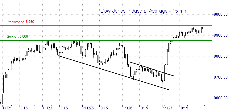 Dow получил мощный заряд роста в среду, поднявшись выше поддержки 8,640 и рос в течении торгов почти вертикально. Индекс, поднявшись с 50%-ной линии Фибоначчи, как мы и ожидали, показал очень сильное ралли, пробив в кончном счете сопротивление 8,880, что хорошо видно на 15-минутном графике. Теперь, после значительной коррекции, которая составила 50%, индекс вполне может показать новые максимумы, продолжив восходящее движение.