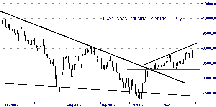 В итоге если индекс сможет удержаться выше поддержки 8,880, то в среднесрочной перспективе вполне реально движение к 9,100. Если посмотреть на дневной интервал, то можно заметить, что индекс продолжает торговаться в пределах расширяющегося треугольника и приближается к верхней границе диапазона 9,100. Это, как раз, и есть цель будущего движения.