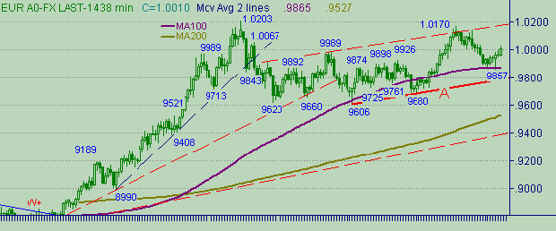 Параметры последнего торгового дня: Open=0.9964, High=1.0001, Low=0.9949, Close= 0.9964. На рис. 1, 2 и 3 приведены графики с периодами день, 480 мин., 60 мин.Сегодняшний максимум, равный 1.0024, превысил уровень паритета и поэтому рынку надо решать − закрывать день выше 1.0000 или нет. Отметим, что и пара фунт/доллар так же подошли к очень важному для них уровню - уровню 1.5700. Решение задача закрытия дня выше 1.5700 для "британца