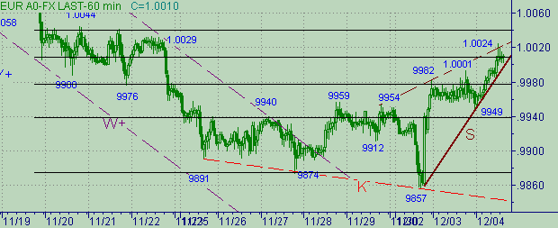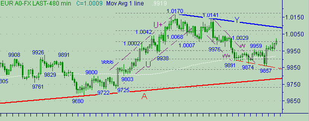 Y на рис. 2; а далее уже 1.0140 и выше. Для движения вниз важны: 1.0000 (линия S на рис. 3), 0.9950 (уровень начала второй восходящей ветки); всё та же, известная нам, проблема закрытия дня ниже 0.9900.Торговые тактики. Покупать от 1.0010, цель 1.0080, стоп-лосс 0.9990.