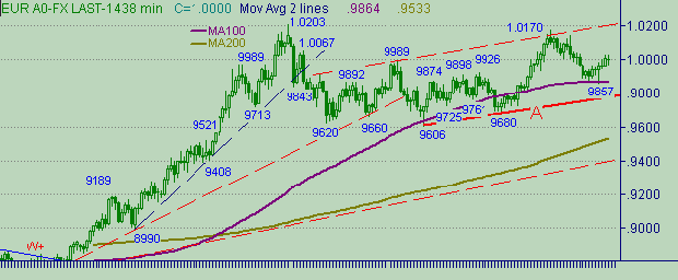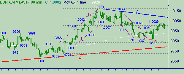 8.15 московского времени. Текущая цена 1.0001. Параметры последнего торгового дня: Open=0.9964, High=1.0029, Low=0.9959, Close= 1.0005. На рис. 1, 2 и 3 приведены графики с периодами день, 480 мин., 60 мин.Рынок смог закрыть день выше 1.0000, но как то не убедительно это сделал. Пять пунктов выше важного уровня ещё не является фактом пробития. Но попытки подняться выше паритеты похвальны.