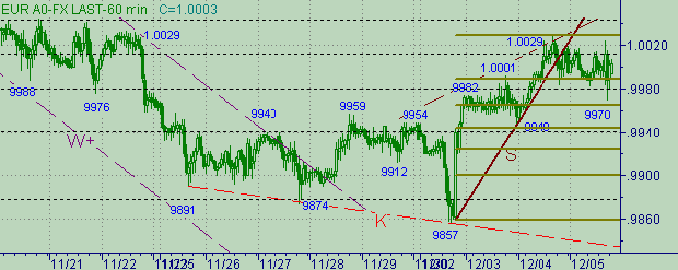 На рис. 3 видим, что продолжается формирование коррекционного движения от роста курса 0.9857(2/12/02)-1.0029(4/12/02). В актив быков можем отнести закрепление их позиций выше 0.9950. Рынок находится между двумя важными уровнями: 0.9950 и 1.0029. На пути к линии Y на рис. 2 необходимо пробиться выше 1.0030/1.0040. Текущее значение линии Y на рис. 2 соответствует значению цены 1.0088.Из торговых тактик наиболее симпатичной выглядит покупки от 0.9950, стоп-лосс 0.9935, цель до линии