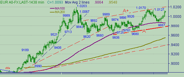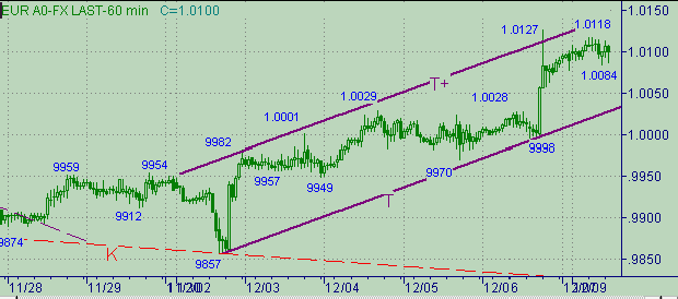 Параметры последней торговой недели: Open=0.9942, High=1.0027, Low=0.9857, Close= 1.0095. Параметры последнего торгового дня: Open=1.0005, High=1.0127, Low=0.9995, Close= 1.0095. На рис. 1, 2 и 3 приведены графики с периодами день, 480 мин., 60 мин.На рис.3 видим изменение курса в течении прошлой недели. Движение состоит из формирования