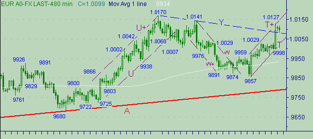 % от роста курса); восходящая ветка 1.0058-1.0118 длина 60п.; сейчас формируется третья ветка − нисходящая. На сегодня можем выделить в качестве ключевых уровней: поддержка − 1.0029; сопротивление - 1.0120. В случае подъема курса выше 1.0130 следующие важные уровни сопротивления: 1.0150 (линия A+ на рис.1), 1.0170(абсолютное равенство длин веток в канале T-T+), 1.0201 (уровень удлинения ветки 0.9857(2/12/02)-1.0029(4/12/02) с коэффициентом 2). Ниже 1.0029 актуальными станут продажи. Ниже текущего уровня приметные уровни: 1.0080 (линия Y на рис. 2), 1.0029(максимум первой ветки в канале T-T+), 0.9998 (начало второй восходящей ветки в канале T-T+).Торговые тактики. Остаемся вне рынка. Держим во внимании вариант работы на пробой линии