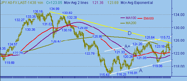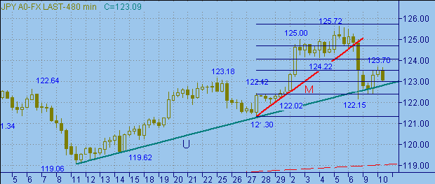 , Low=122.38, Close= 123.30. На рис. 1, 2 и 3 приведены графики с периодами день, 480 мин. и 60 мин.В пятницу укрепление йены на 284п. (124.99-122.15) началось непосредственно от линии