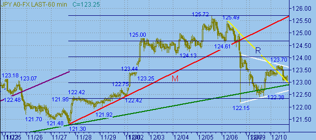 U на рис. 2 (текущее значение линии соответствует значению цены 122.96). Для фиксации превосходства быков рынку необходимо подняться выше интервала цен 124.36(равенство локальных up-веток 122.38-123.70 и ветки с началом от 123.04) - 124.50(линия down-тренда с началом от 125.72(5/12/02)). В пределах интервала 122.96-124.50 движение можно назвать как неопределенное. Участникам необходимо сформировать намерение, обозначить его, преодолеть инерцию рынка и сформировать первый импульс. В случае опускания ниже 122.96 в качестве целевых областей можем ожидать уровни цен 121.40, 119.80, 119.06.Торговая тактика. Оставаться вне рынка. Следить за структурой формируемых локальных трендов.