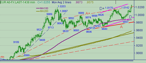 3 приведены графики с периодами день, 480 мин., 60 мин.Сегодняшняя дневная свеча пытается закрепиться выше линии A+ на рис. 1. Дополнительно на наших графиках обозначаем новые возможные восходящие каналы: канал D-D+ на рис. 1 и 2 с началом от 0.9680(21/10/02); канал N-N+ на рис. 2 и 3 с началом от 0.9857(2/12/02); канал K-K+ на рис. 3 с началом от 1.0081 (12/12/02).