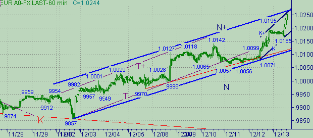 - канал N-N+ на рис.2 и 3: первая ветка 0.9857(2/12/02)-1.0142(10/12/02) длиной 285п.; вторая ветка началась от 1.0056(11/12/02) и в случае равенства длин веток получаем цель на уровне 1.0341;