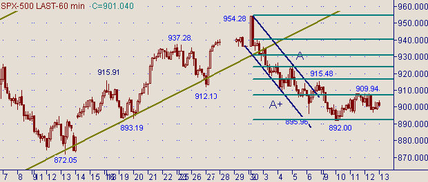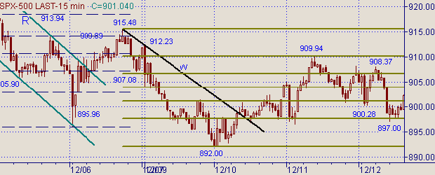 3 приведены графики с периодами 15 мин., 60 мин. и деньПоследние два дня рынок формирует коррекционное движение от нисходящего локального тренда 915.48(6/12/02)-892.00(10/12/02) − см. на рис. 1. Максимум среды, равный 909.94, соответствует уровню 76.4% коррекции от этого движения. Для продолжения своего нисходящего тренда индексу необходимо опуститься ниже 892.00. После открытия торговой сессии рынок попробует определить свое положение относительно этого уровня. Основной проблемой для медведей является последовательное уменьшение длин нисходящих веток в движении с началом от 954.28(2/12/02): 954.28-909.51 длина 4477; 925.25-895.96 длина 2929; 915.4