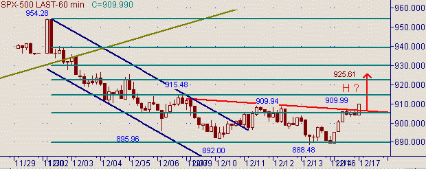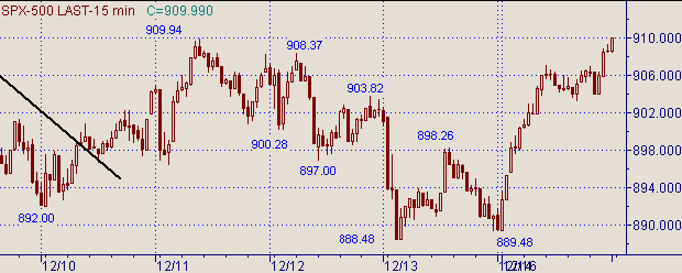 Параметры последнего торгового дня фондового рынка: Open=889.48, High=909.99, Low=889.48, Close= 909.99. На рис. 1, 2 и 3 приведены графики с периодами 15 мин., 60 мин. и деньВчерашний бычий настрой рынка остановило только закрытие торговой сессии, а так же максимум прошлой недели, равный 909.94(11/12/02). День закрылся почти на уровне 23.6% коррекции, равный 910.45, от