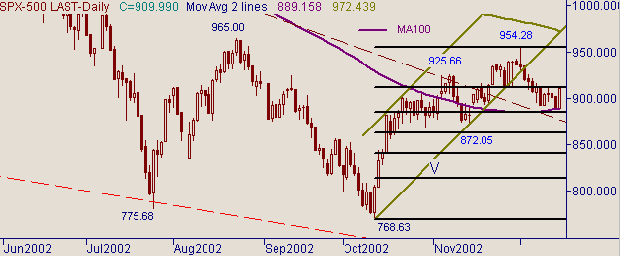 up-тренда 768.63(11/10/02)-954.28(3/12/02) − см. на рис. 3. Отметим, что позавчерашний торговый день протестировал на дневном графике MA100 − см. на рис. 3.На рис. 2 видим, что последняя часовая свеча закрылась выше красной линии, которую можно предположительно рассматривать как линию шеи фигуры двойное дно для