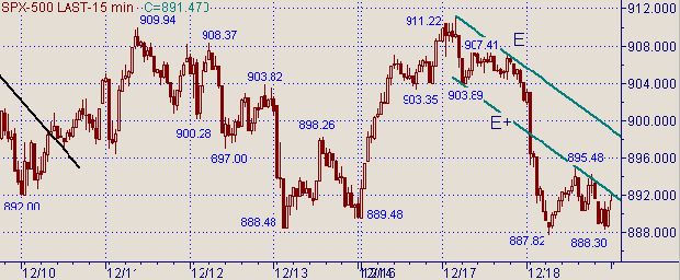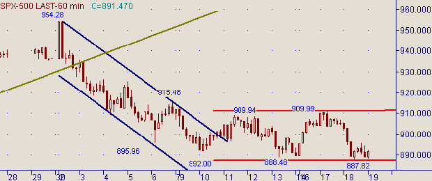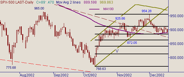 Параметры последнего торгового дня фондового рынка: Open=902.99, High=902.99, Low=887.82, Close= 891.47. На рис. 1, 2 и 3 приведены графики с периодами 15 мин., 60 мин. и день На приведенных рисунках видно, что обозначились границы горизонтального диапазона: верхняя граница − уровень 23.6%, равный 910.46, от up-тренда 768.63(11/10/02)-954.28(3/12/02); нижняя граница − дневной MA100 (текущее значение соответствует значению цены 889.60). В качестве разделительной черты в горизонтальном диапазоне выступает MA21 на часовом графике (текущее значение MA21 соответствует значению цены 900.35). В случае прорыва нижней границы диапазона в качестве технической цели получается область значений индекса 861.45-863.00. Уровню 861.45 соответствует фиба 50% от роста курса 768.63(11/10/02)-954.28(3/12/02) (см. на рис. 3), а уровню 863.00 соответствует цель на отработку ширины горизонтального диапазона.Рассматривая текущую ситуацию с технической точки зрения считаем вариант на движения до верхней границы диапазона и вариант на прорыв нижней границы равнозначными. В пользу первого сценария говорит, например попадание на часовых графиках