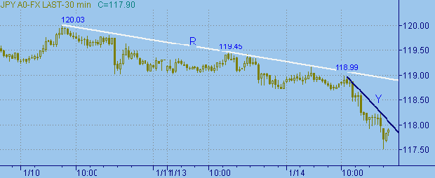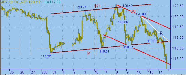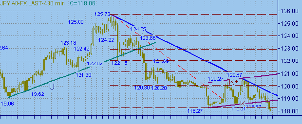 A на рис. 1. Рассматривая ветку на рис. 1 125.72(5/12/02)-118.27(30/12/02) замечаем, что её длина составляет 745п. Если подобная ветка началась от 120.57(7/01/03), то в перспективе мы можем увидеть 113.12 − случай равенства длин нисходящих веток. С технической точки зрения ожидаем сильную поддержку вблизи области 117.20-116.95. А далее только 115.40 может остановить караван к 113.00. Локальные области сопротивления можем встретить на трендовых линиях down-поддвижений на рис. 4: линия R соответствует цене 118.93, а линия Y соответствует 1218.05. Из рассмотрения локальных точек экстремумов на графиках имеем область сопротивления − интервал 118.50-118.70.Из торговых тактик наиболее симпатичной является открытие продаж от 118.50, стоп-лосс располагать выше линии