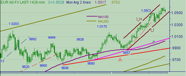 - см. на рис. 3. Кроме того, на рис. 2 видим, что попутно рынок протестировал и максимум первой восходящей ветки, равный 1.0503(31/12/02), в канале U-U+ на рис. 2. К тому же вспомним, что уровень 1.0497 у нас ранее использовался для дневных свечей в качестве "подсказывающего" уровня (критерий закрытие свечи выше этого уровня). В общем сегодня мы прикоснулись вместе с евро/доллар к примечательному и заметному уровню 1.0500.Для движения наверх графика в качестве важного бычьего сигнала остается закрытие часа (лучше закрытие дня) выше уровня 1.0585. В этом случае рынок перейдет в рабочий диапазон 1.0585-1.0660.
