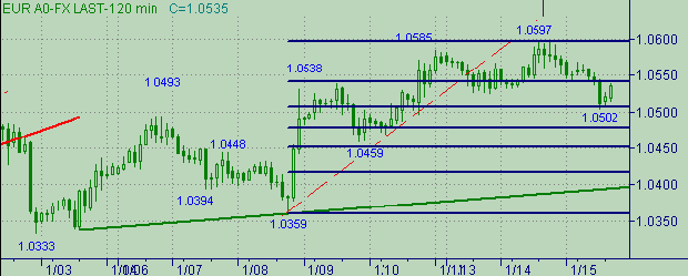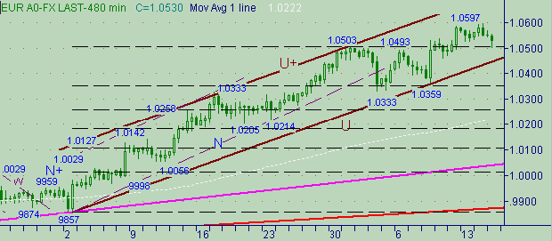 down-движение. Можно выделить следующие ожидаемые медвежьи сигналы: закрытие дня ниже 1.0497; закрытие свечи с периодом 480мин. ниже линии U на рис. 2 (текущее положение линии U соответствует значению цены 1.0447); закрытие дневной свечи ниже дневной MA14 (текущее значение MA14 соответствует значению цены 1.0481).Сейчас рынок формирует коррекционное движение от роста курса 1.0359(8/01/03)-1.0597(14/01/03) − см. на рис. 3. Евро/долар сегодняшним минимумом, равным 1.0502, отмерили уровень коррекции 38.2%