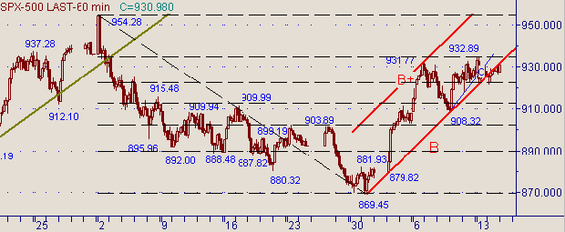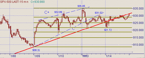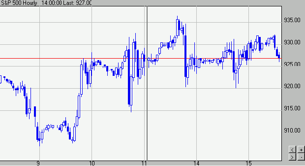 и 3 приведены графики с периодами 15 мин.(индекс S&P500), 60 мин. (индекс S&P500), 60мин.(фьючерс на S&P500).Рынок не пошел ни наверх графика ни вниз, а значение индекса стали изменяться в коридоре. Вчерашний минимум повторно протестировал уровень 50% коррекции от роста 908.32(9/01/03)-935,05(13/01/03) −см. на рис. 1. Таким образом, линия