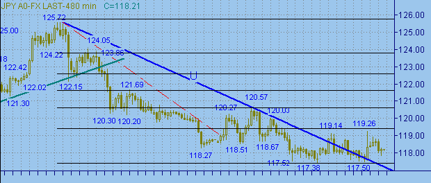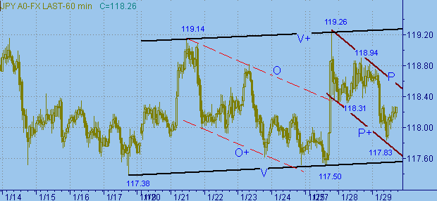 V-V+ на рис. 2. В down-канале P-P+ сформировались две нисходящие ветки 119.26-118.31 длиной 95п. и 118.94-117.83 длиной 101п. Общая длина движения 119.26-117.83 составила 143п.Торговые планы не изменились. Оставаться вне рынка. Покупки рассматривать при подходах к линии