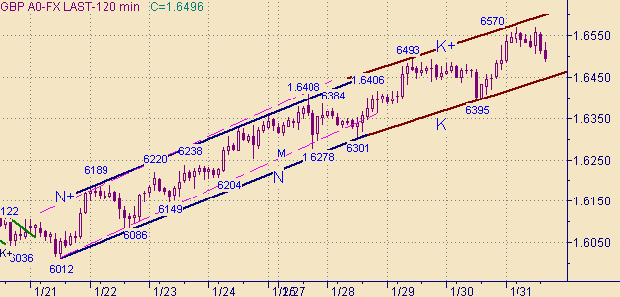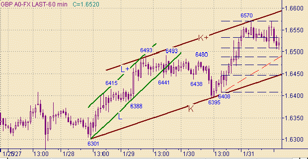 K и K+. Сейчас уровень 1.6500 является хорошим техническим уровнем поддержки. На рис. 4 видим, что сегодняшний минимум пытается тестировать уровень коррекции 38.2% (равен 1.6508) от последнего локального up-тренда 1.6408-1.6570.Разложим движение в канале