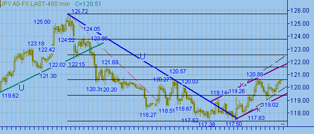 Параметры последнего торгового дня: Open=119.82, High=120.41, Low=119.57, Close= 120.25. На рис. 1, 2, и 3 приведены графики с периодами день, 480мин. и 60 мин.