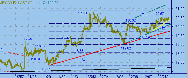 Доллар/йена сохраняют границы канала E-E+. Целью для этого движения мы рассматривали уровень 120.80. Торговый план остается в силе. Можем предложить три варианта продолжения: закрытие позиции при подходе к 120.50. Второй вариант: сохраняем открытые позиции на покупку, цель на 120.80, стоп-лосс переносим на 120.20. В пользу второго варианта − хороший потенциал у технических индикаторов для движения в область перекупленности. Третий вариант: в случае тестирования 120.80 переносим стоп-лосс ниже 120.50 и пытаемся подержать позицию, т.к. потенция в росте курса доллара заложена в 96п. (длина вчерашне-сегодняшнего локального канала). Для третьего варианта − цель 121.20.