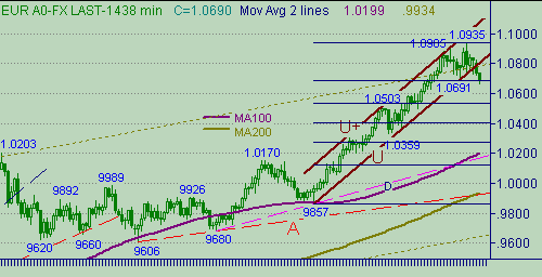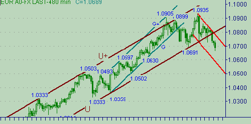 B на рис. 3, цель 1.0630. В случае опускания ниже 1.0630 искать возможности (например, при тестировании снизу 1.0630 и подтверждении сигналами компьютерного анализа на графиках с периодом менее 60мин.) открытия позиции на продажу с целью 1.0540. При опускании курса ниже 1.0525 рассматривать постановку продаж с целью 1.0420, перенос стоп-лосса при достижении курса 1.0470. В случае роста курса выше линии B на рис. 3 искать локальный максимум (например с помощью сигналов компьютерного анализа, рассмотрения варианта для тестирования линии U на рис. 1 и 2). При отсутствии сигналов для обнаружения возможного локального максимума − оставаться вне рынка.Sup: 1.0665, 1.0630, 1.0540/25, 1.0465, 1.0415/95, 1.0360, 1.0265, 1.0170, 1.0111, 1.0000.